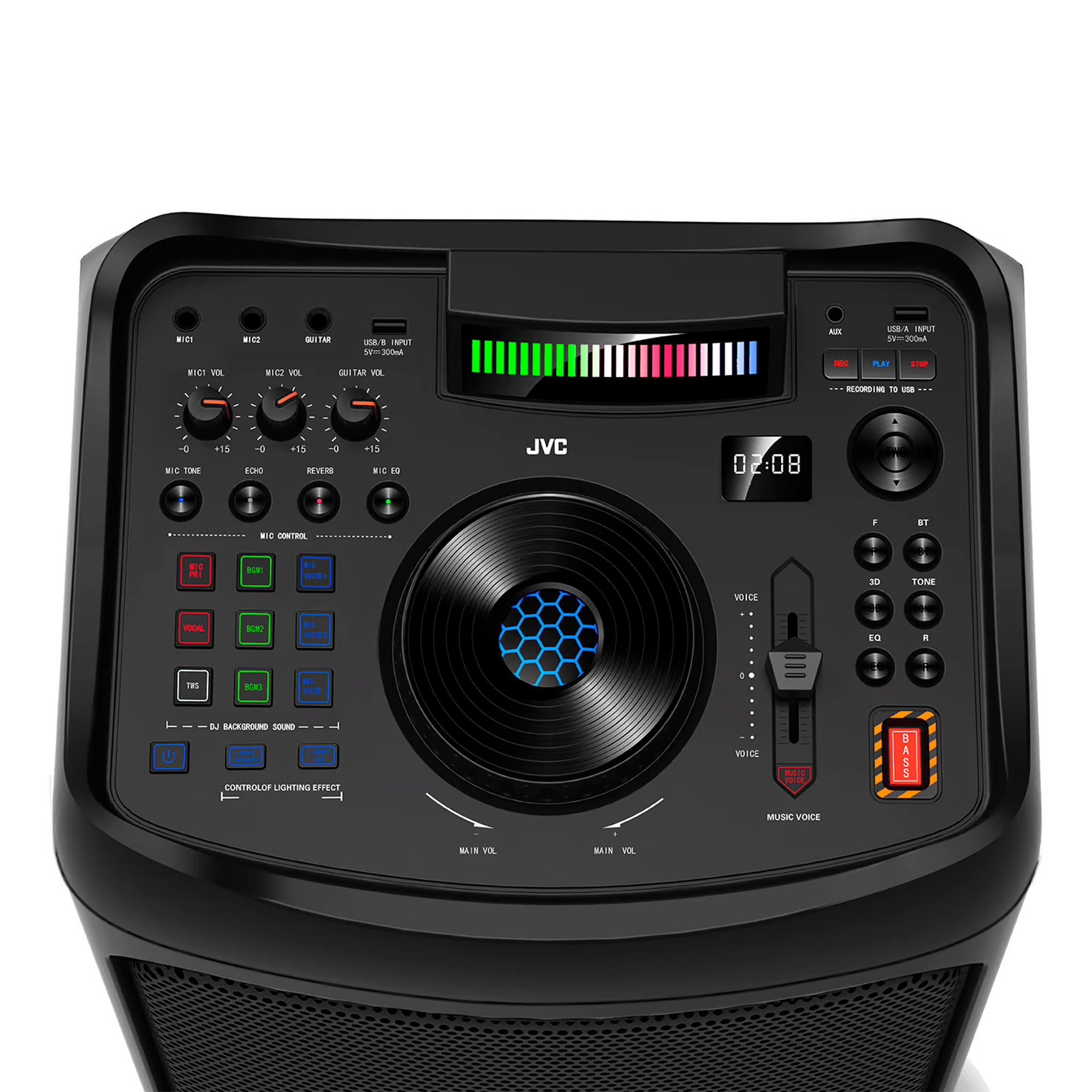Corneta JVC de 200 Watts RMS, diviértete con las funciones de DJ y los 8 efectos de luz, sube la fiesta a otro nivel.