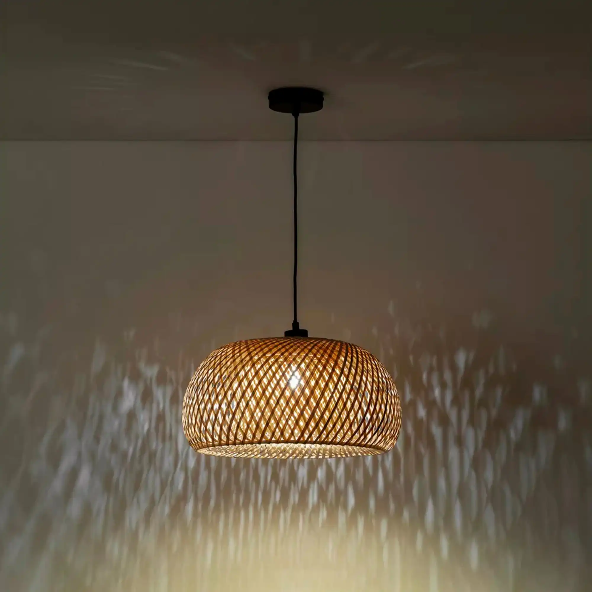 La lámpara de techo Hana es de doble capa de bambú, el material de fibras vegetales que se ha vuelto tan de moda en el sector de la decoración de interiores. En realidad, este tipo de lámparas han sido tejidas con cañas de bambú artesanal; tiene un trenzado natural de gran atractivo.